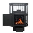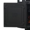 Особенность печи — универсальная топочная дверка, которая может модифицироваться как в панорамную — каминную со стеклом, так и в чугунную. Для трансформации из чугунной дверки в каминную необходимо приобрести термостойкое стекло, далее с тыльной стороны дверки открутить крепления, убрать чугунную вставку и на ее место установить стекло. Термостойкое стекло в комплект поставки не входит, а приобретается как дополнительная опция.