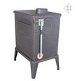Печь изготовлена из серого чугуна с толщиной стенок 8 мм. Чугун обладает высокой теплопроводностью, буржуйка начинает отдавать тепло в помещение сразу после затопки. Мощности печи 13 кВт достаточно для отопления загородного дома площадью до 130 м2. Печь имеет герметичную топку и работает в режиме длительного горения с КПД 75%. Благодаря встроенному термостату (регулятор тяги) печь работает в режиме заданной температуры.